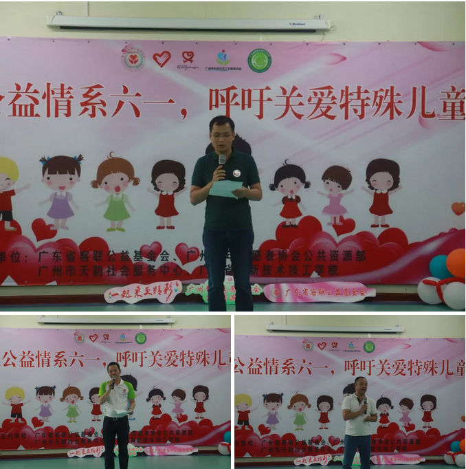 活動首先由主辦單位廣東省客聯(lián)公益基金會鄧爭明理事長、廣州市青年志愿者協(xié)會張軍文和協(xié)辦單位廣州天韻社會服務(wù)中心鄒雷理事長講話,向“廣州市天韻社會服務(wù)中心”的小朋友們和辛勤勞動的老師們表示真摯的節(jié)日問候。