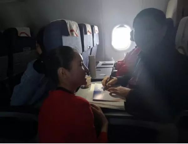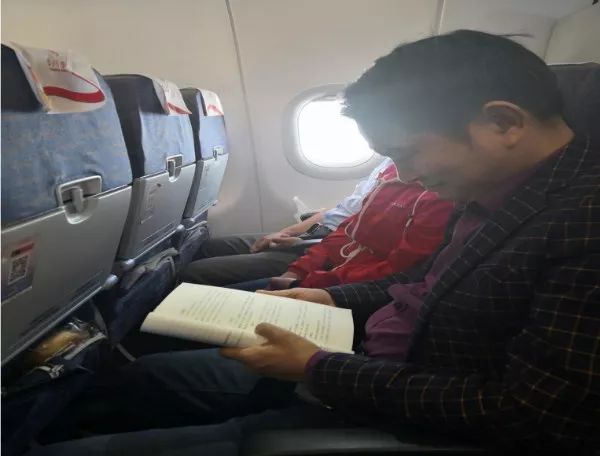 飛機上,窗外的雪景讓人動心。窗內(nèi)的景致也讓人動情——曾良策校助、邢斌老師、楊乾海老師、黃俊老師都利用碎片時間看書。特別讓我們感到神奇的是,飛機上一位素不相識的空姐,看到認真閱讀的曾校助,居然非常崇拜地蹲下來求他簽字留言,成為曾校助又一個空姐粉絲。
