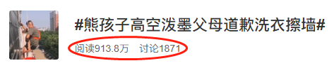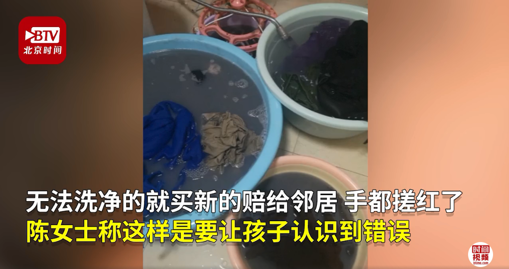 事情發(fā)生后,熊孩子的父母“兵分兩路”迅速補救:孩子媽媽帶著孩子挨家挨戶敲門道歉,并承諾把臟的衣服讓孩子手洗恢復,孩子爸爸請高空作業(yè)的保潔公司幫忙恢復墻體,要求孩子一直站在太陽底下看著,直到清潔工人清潔完畢,方可離開。