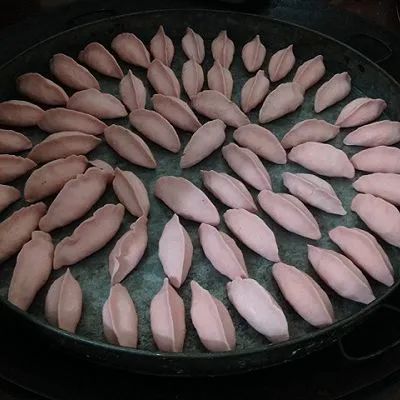 重點(diǎn)說(shuō)說(shuō)我愛(ài)吃的芋頭餃吧,把它含在嘴里時(shí)滑溜溜的,如同泥鰍。選用粉粉軟糯、有粘性的芋頭,和番薯粉一起揉成面團(tuán),然后再包肉餡。煮好的芋餃吃起來(lái)既糯又柔,滑溜可口。