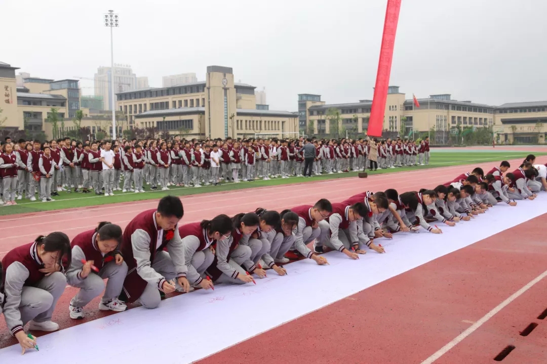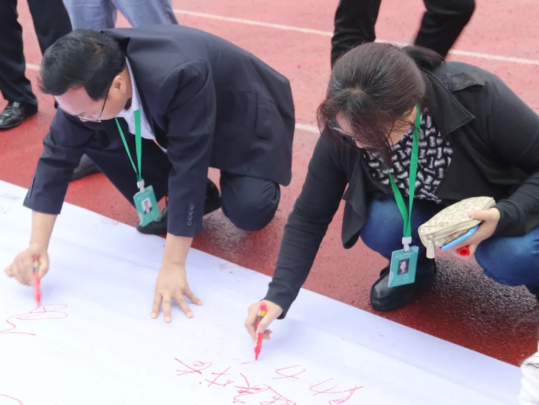 之后,師生們來到了百米長卷面前,用筆墨書寫了心聲和誓言。大家不忘初心,牢記使命。主席臺(tái)上,高一年級(jí)的張?jiān)婄?、曾伊萌、孔令羽和鄭暢同學(xué)為我們帶來了歌曲演唱《最初的夢(mèng)想》。歌聲飄蕩在衡川運(yùn)動(dòng)場(chǎng)的上空,最初的夢(mèng)想永遠(yuǎn)在我們心中。