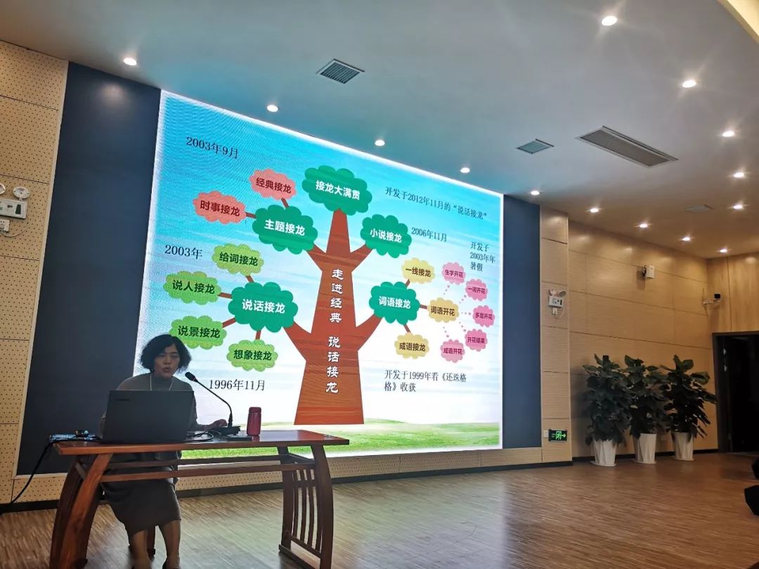 課堂結(jié)束后,丁老師又在階梯教室進(jìn)行了《說(shuō)話接龍之積累、激活、應(yīng)用》的講座,和老師們分享了“生字開(kāi)花 ”“說(shuō)話接龍”教學(xué)的意義和具體實(shí)施方法。