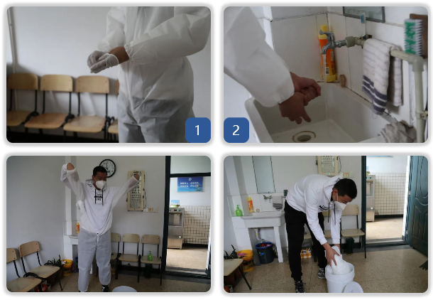 安全應(yīng)急處置和引領(lǐng)負(fù)責(zé)人趙老師按照規(guī)定和程序脫掉和處理防護(hù)用品。
