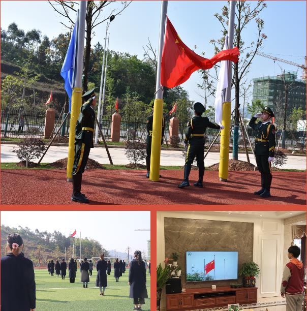 春光明媚,花開正好,旗手在學(xué)校操場(chǎng)上將鮮艷的五星紅旗冉冉升起,全體師生起立,高唱國歌,隔空向國旗行注目禮。