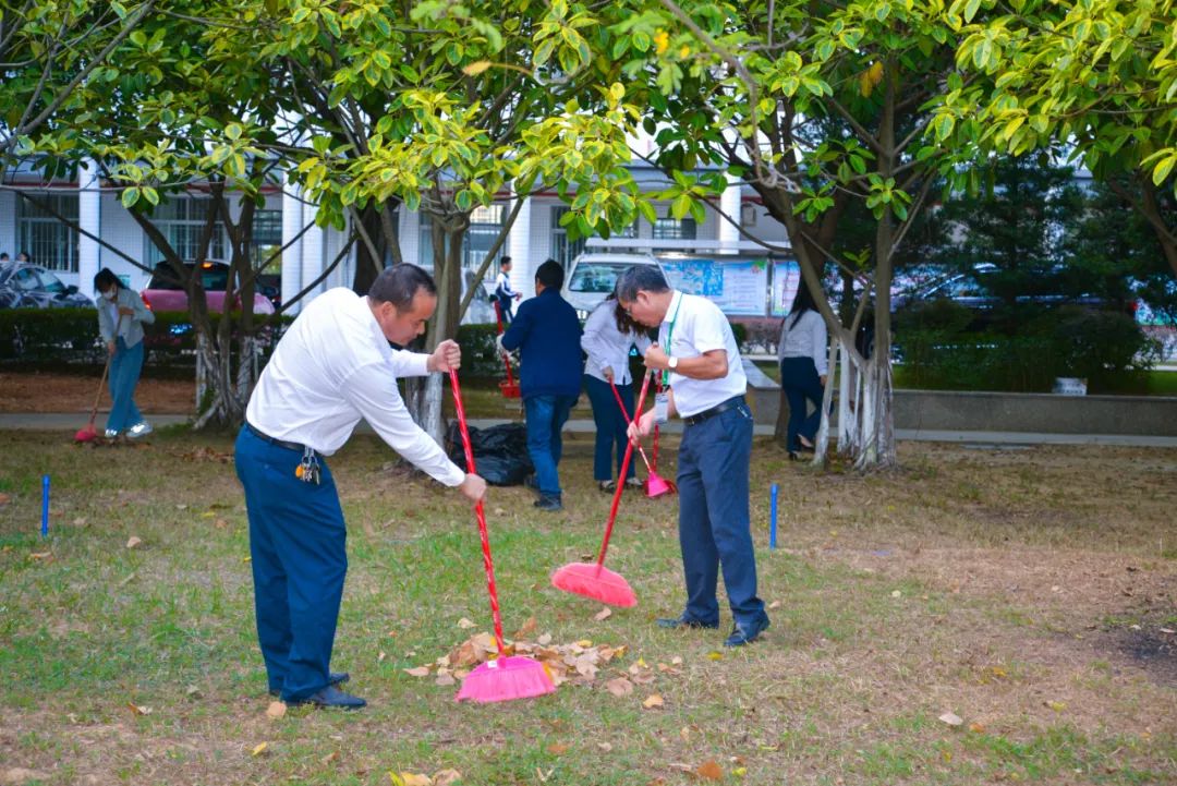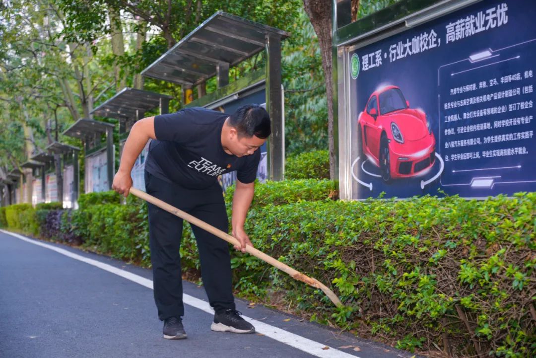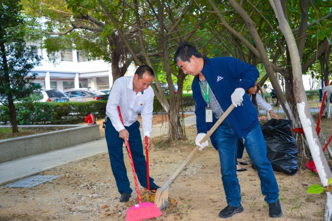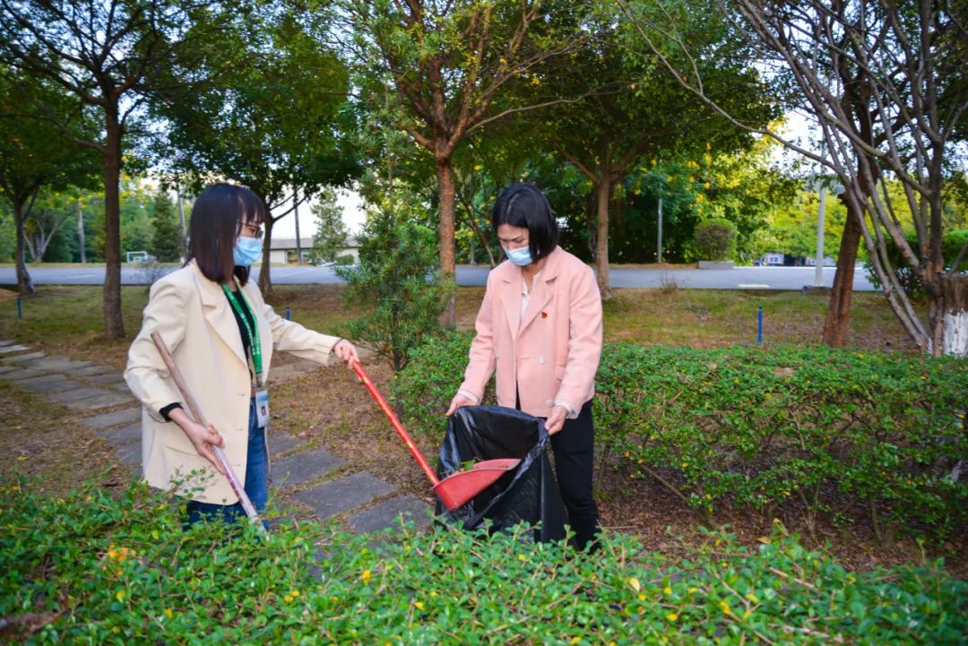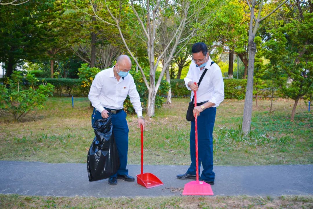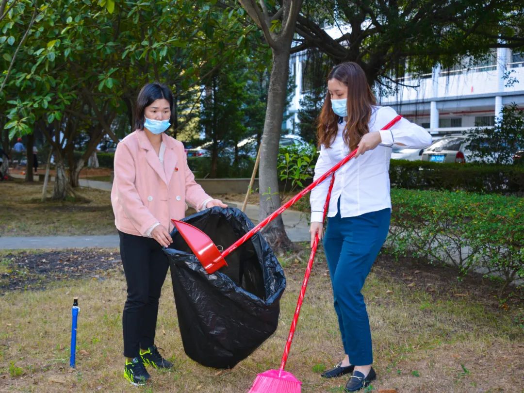 簽約儀式結束后,兩個黨支部全體黨員分成4個小組,聯(lián)合開展校園衛(wèi)生清潔活動。